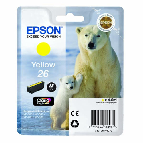 →Струйный принтер является необходимым инструментом для работы в офисе. Epson 26 Yellow T2614 - картридж стандартной емкости с водорастворимыми желтыми чернилами. Подходит для XP 600 / 605 / 700. Ресурс этого картриджа составляет 300 страниц. Этот картридж, как и любой другой, выбранный Вами расходный материал, мы с легкостью доставим к Вам в офис, как непосредственно в Киеве, так и по всей Украине.