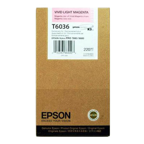 →Epson T6036 Vivid Light Magenta – расходный материал для широкоформатных принтеров Stylus Pro-7880, Stylus Pro-9880. Емкость картриджа – 220 мл. Расход чернил 900 страниц формата А4. Цвет печати – насыщенный светло-пурпурный. Купить картридж и заказать его доставку можно в наших магазинах или на данном интернет портале. Доставка товаров реализуется Новой почтой.