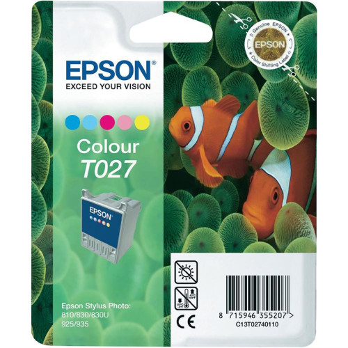 Оригинальный картридж Epson T027 (C13T02740110), для принтеров Stylus Photo 810/ 830/ 925/ 935. Ресурс печати - 220 страниц А4 при 25% заполнении. Цвет - пятицветный. Купить товар Epson T027 (C13T02740110) можно в Киеве заказав на нашем сайте. Продажа и доставка по Украине осуществляется в города, в которых есть отделения транспортной компании «Новая почта».